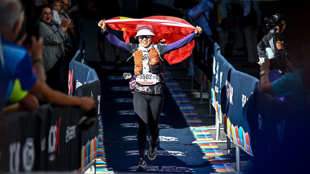 中國(guó)選手蔣汶利在100公里組別中抵達(dá)終點(diǎn)