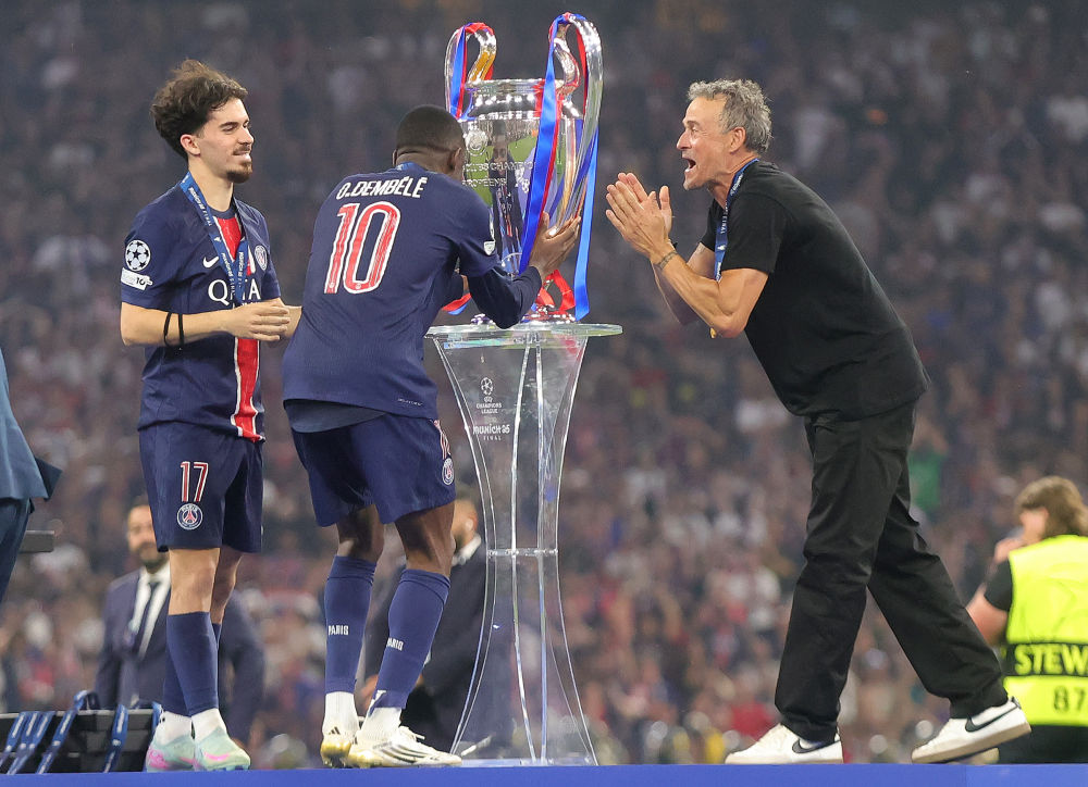 5月31日,巴黎圣日耳曼隊主教練恩里克(右)與登貝萊(中)慶祝收獲隊史第一座歐冠冠軍獎杯。新華社發(fā)(菲利普·魯伊茲攝)