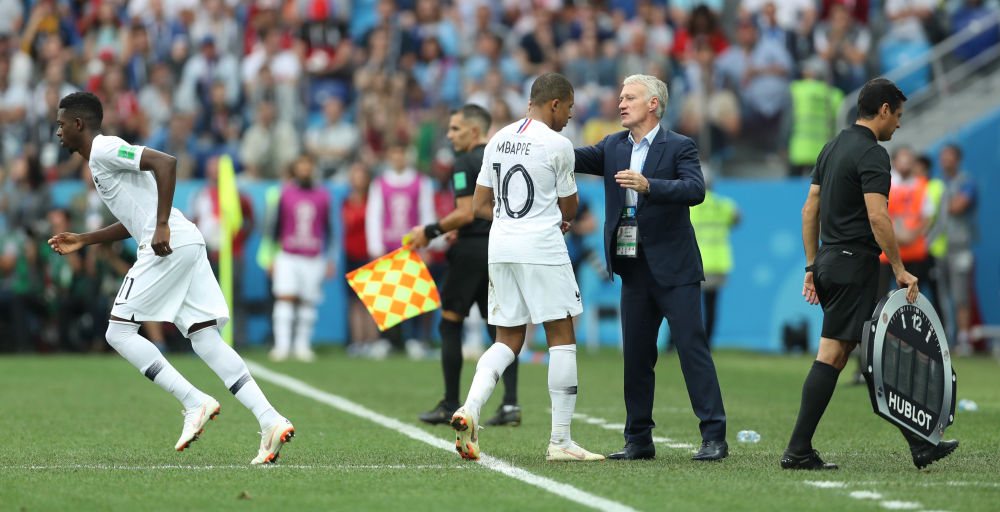 在2018俄羅斯世界杯四分之一決賽中,登貝萊(前左一)替換姆巴佩(前中)。新華社記者 費(fèi)茂華 攝