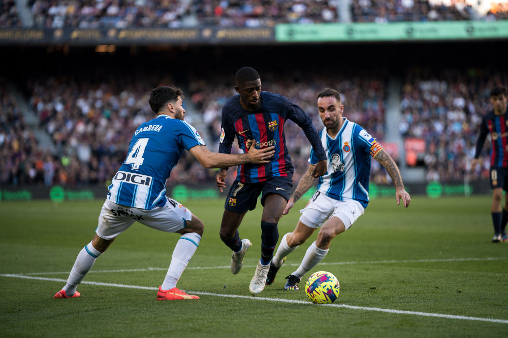 2022年12月,在西甲聯(lián)賽第15輪比賽中,效力于巴塞羅那隊的登貝萊(中)試圖突破西班牙人隊球員的防守。新華社發(fā)(喬安·戈薩攝)