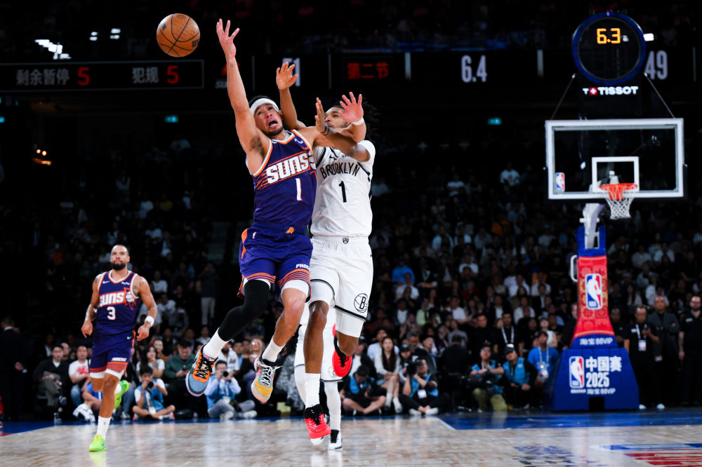10月12日,太陽(yáng)隊(duì)球員德文·布克(左前)在比賽中進(jìn)攻受阻。新華社發(fā)(張金加攝)