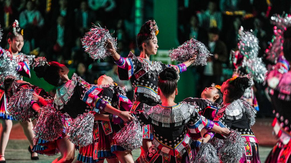 4月13日,演員在啟動(dòng)儀式上進(jìn)行歌舞表演。當(dāng)日,大地流彩·2025年全國和美鄉(xiāng)村籃球大賽(村BA)啟動(dòng)儀式在貴州省黔東南苗族侗族自治州臺江縣臺盤村舉行。新華社記者 陶亮 攝