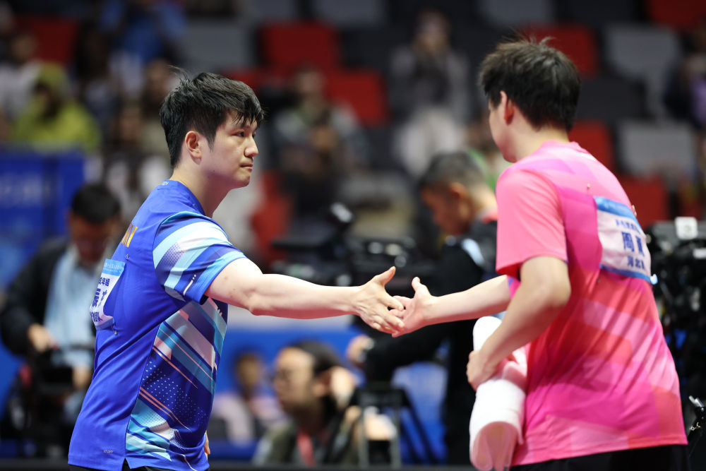 11月10日,樊振東(左)在比賽后和周雨握手。新華社記者 劉續(xù) 攝