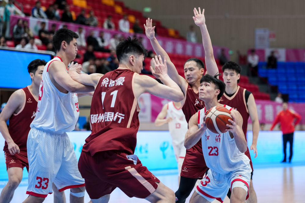 11月4日,浙江隊球員王奕博(右三)和隊友并肩防守。新華社記者 李博 攝