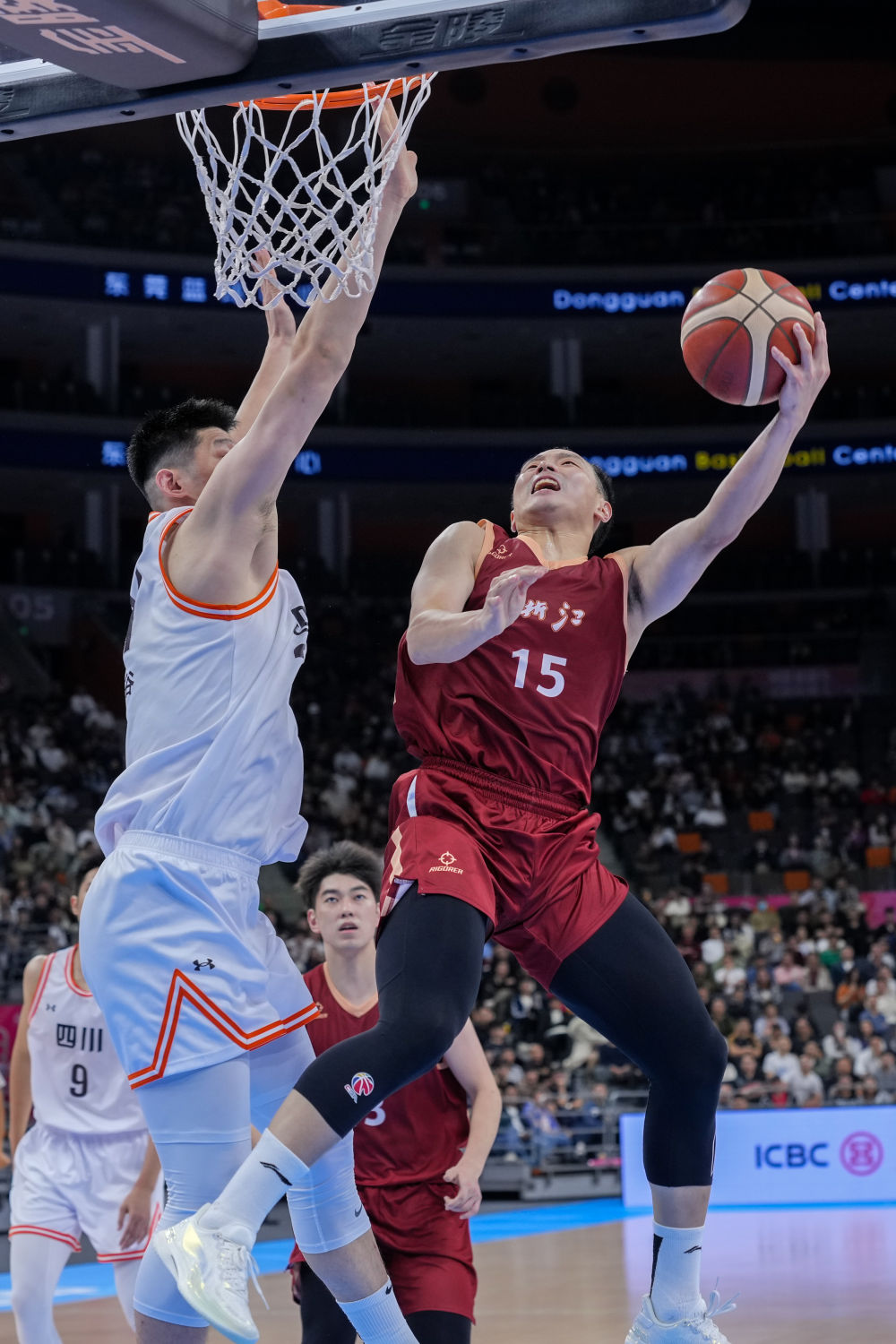 11月11日,浙江隊球員王奕博(右)在比賽中突破上籃。新華社記者 李博 攝