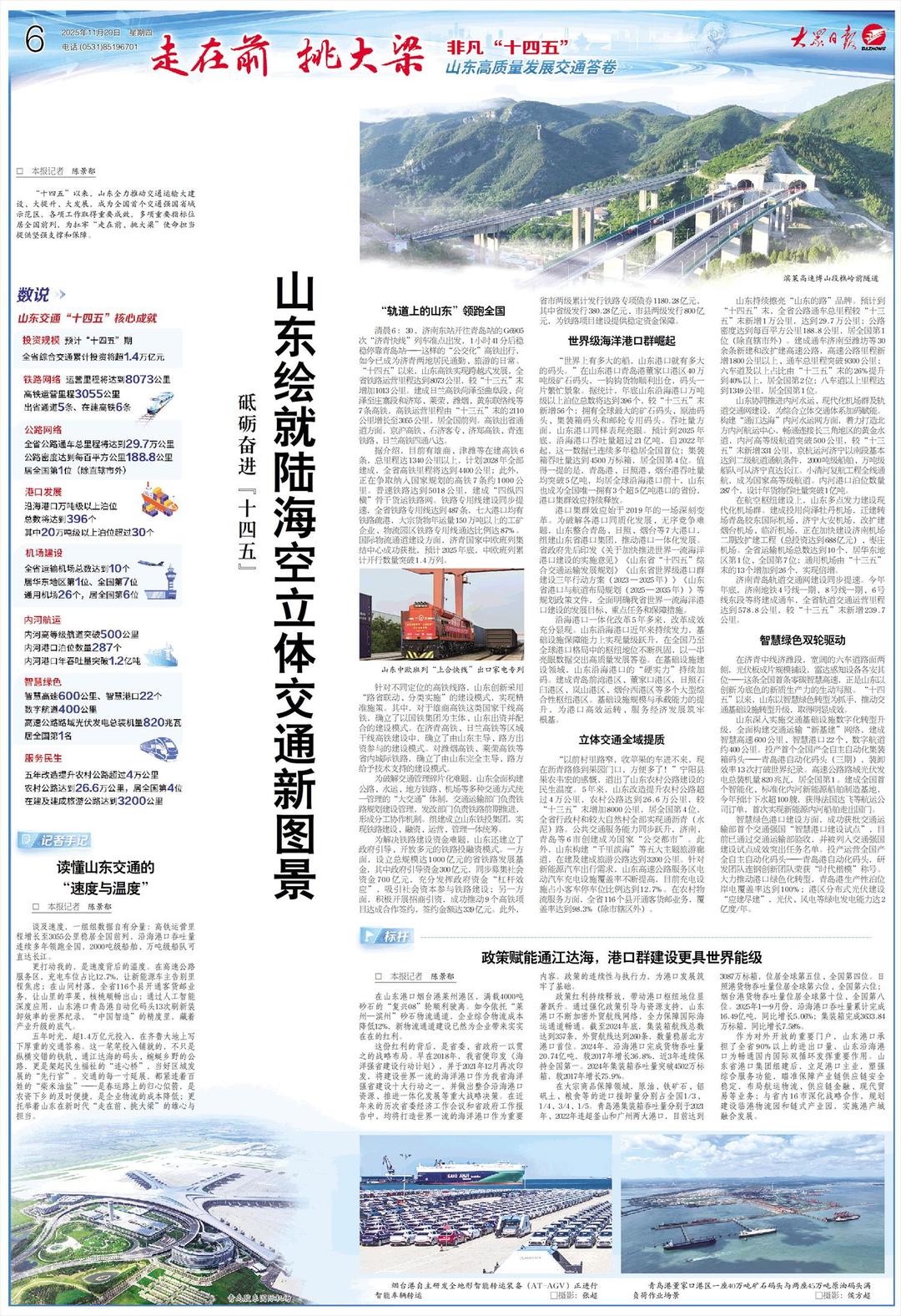 “十四五”以來(lái),山東全力推動(dòng)交通運(yùn)輸大建設(shè)、大提升、大發(fā)展,成為全國(guó)首個(gè)交通強(qiáng)國(guó)省域示范區(qū),各項(xiàng)工作取得重要成效,多項(xiàng)重要指標(biāo)位居全國(guó)前列,為扛牢“走在前、挑大梁”使命擔(dān)當(dāng)提供堅(jiān)強(qiáng)支撐和保障。