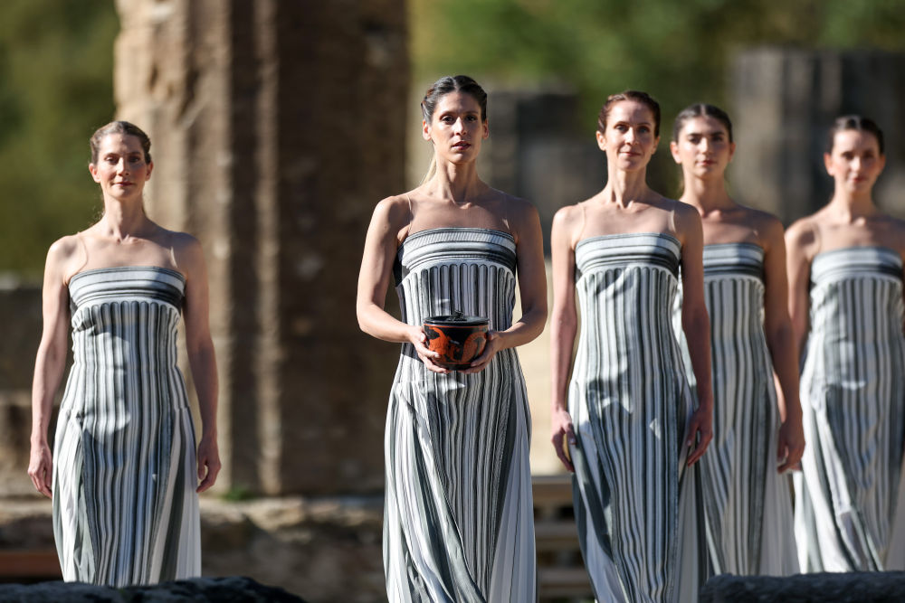 11月24日,一名扮演女祭司的演員手捧火種罐入場(chǎng)。當(dāng)日,2026年米蘭-科爾蒂納冬奧會(huì)圣火火種采集儀式在希臘伯羅奔尼撒半島的古奧林匹亞遺址舉行彩排。新華社記者 李京 攝