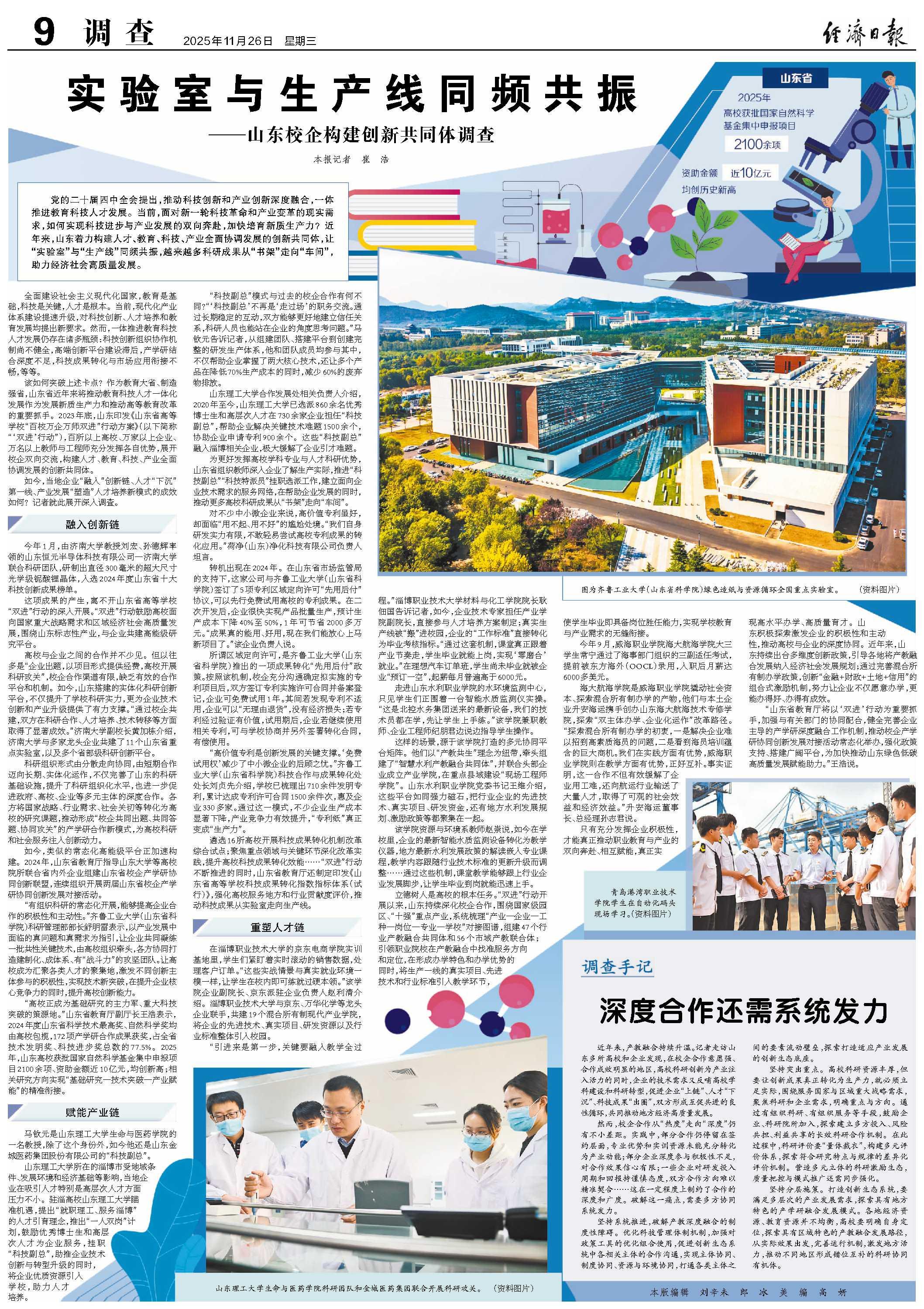 “高校正成為基礎(chǔ)研究的主力軍、重大科技突破的策源地?!鄙綎|省教育廳副廳長王浩表示,2024年度山東省科學(xué)技術(shù)最高獎、自然科學(xué)獎均由高校包攬,172項產(chǎn)學(xué)研合作成果獲獎,占全省技術(shù)發(fā)明獎、科技進步獎總數(shù)的77.5%。2025年,山東高校獲批國家自然科學(xué)基金集中申報項目2100余項、資助金額近10億元,均創(chuàng)新高;相關(guān)研究方向?qū)崿F(xiàn)“基礎(chǔ)研究—技術(shù)突破—產(chǎn)業(yè)賦能”的精準(zhǔn)銜接。
