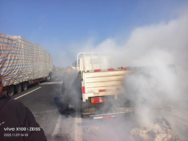事情發(fā)生在11月9日上午,53歲的張憲良和董亞開著私家車,正趕往黃島看望朋友。當(dāng)車輛行駛至日蘭高速距離莒縣服務(wù)區(qū)還有6公里處時,前方路面突然升起的滾滾濃煙打破了平靜。“老遠(yuǎn)就看見黑煙沖天,走近了才發(fā)現(xiàn)是一輛小貨車在著火,火焰都躥到很高了?!睆垜椓蓟貞浀溃?dāng)時貨車的輪胎、車廂里的棉衣棉被都在燃燒,引擎蓋下方更是火光四射,隱約能看到油箱的位置,情況十分危急。