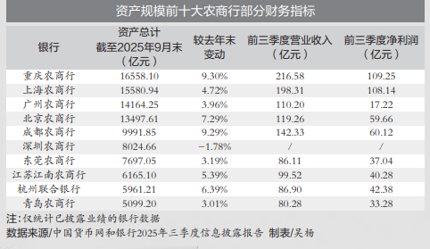 如今,新萬億農(nóng)商行的競逐格局已逐漸清晰。成都農(nóng)商行是最具確定性的“候選人”——截至三季度末,其資產(chǎn)規(guī)模距萬億元僅差不足20億元,較二季度末增長1.58%,年末有望突破萬億元;7.34%的營收同比增速與6.97%的凈利潤同比增速,實現(xiàn)“規(guī)模+盈利”雙高。深圳農(nóng)商行、東莞農(nóng)商行、杭州聯(lián)合銀行等構(gòu)成“潛力梯隊”,資產(chǎn)規(guī)模均有望跨上萬億元臺階。