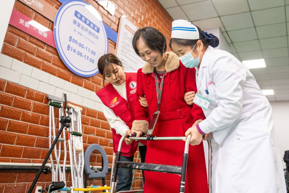 2025年11月6日,志愿者及醫(yī)務(wù)人員在湖南長(zhǎng)沙望城區(qū)高塘嶺街道中南社區(qū)幫助行動(dòng)不便的居民使用康復(fù)器具。