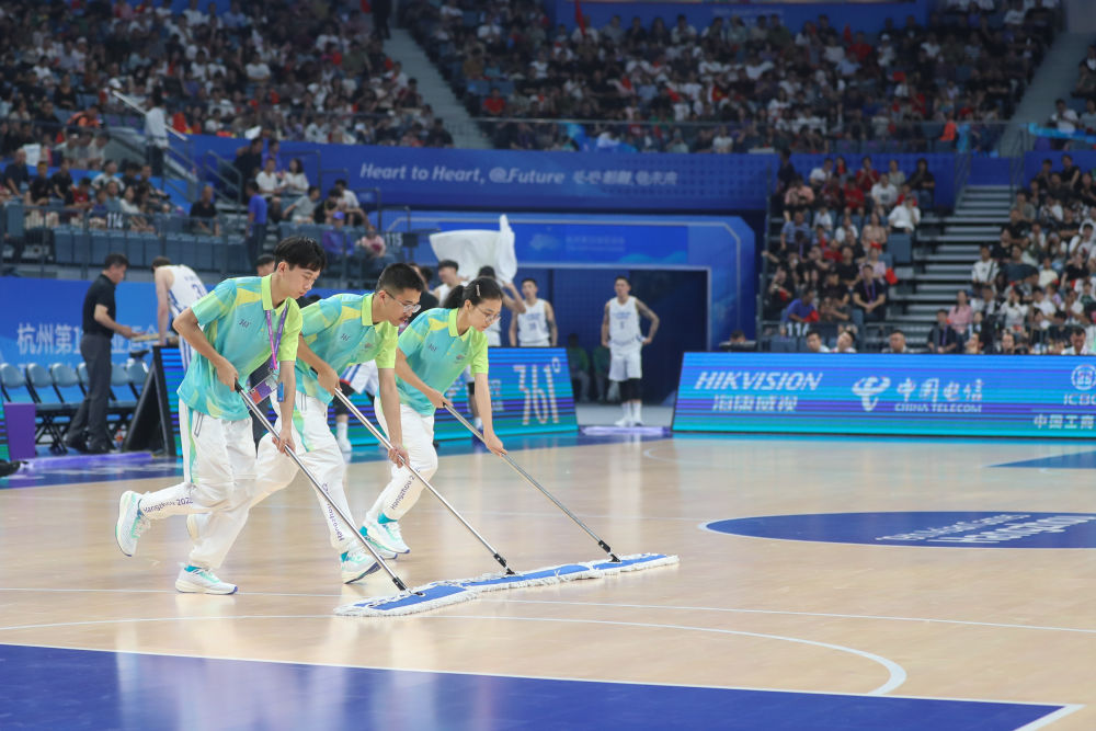 2023年9月28日,杭州亞運(yùn)會(huì)志愿者“小青荷”在杭州亞運(yùn)會(huì)籃球男子預(yù)賽B組比賽前清潔場(chǎng)地。從2016年二十國(guó)集團(tuán)領(lǐng)導(dǎo)人杭州峰會(huì)以來(lái),“小青荷”這一志愿服務(wù)工作品牌已成為杭州大型賽會(huì)服務(wù)的一張金名片。