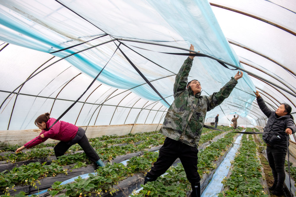 2023年12月15日,志愿者在浙江湖州長(zhǎng)興縣水口鄉(xiāng)幫助農(nóng)戶加蓋大棚保溫膜。為應(yīng)對(duì)強(qiáng)雨雪天氣,志愿者們幫助農(nóng)戶清理大棚上的積雪,加裝綁棚繩,棚內(nèi)增設(shè)立柱,提高大棚抗風(fēng)雪能力,確保農(nóng)產(chǎn)品正常生產(chǎn)供應(yīng)。