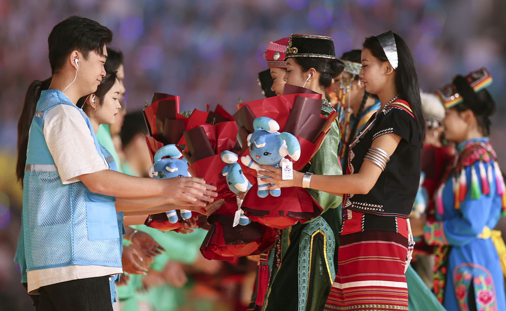 2024年11月30日,五十六個(gè)民族代表在海南三亞舉行的第十二屆全國(guó)少數(shù)民族傳統(tǒng)體育運(yùn)動(dòng)會(huì)閉幕式上為志愿者獻(xiàn)花。運(yùn)動(dòng)會(huì)期間,數(shù)千名志愿者“小鹿鹿”奔赴十余個(gè)競(jìng)賽場(chǎng)館、二十多家接待酒店、媒體中心、機(jī)場(chǎng)車站等地,為來(lái)自全國(guó)各地的運(yùn)動(dòng)員、技術(shù)官員、工作人員和觀眾提供禮賓接待、交通引導(dǎo)、安全保衛(wèi)等志愿服務(wù)。