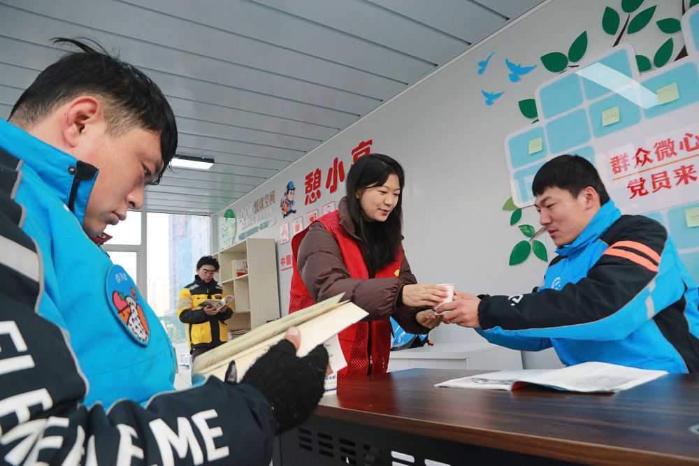 2023年12月27日,志愿者在山東省高密市密水街道“憩小亭”服務(wù)站為外賣騎手送上熱水。入冬以來(lái),山東省高密市密水街道推進(jìn)“憩小亭”暖心服務(wù)站建設(shè),為外賣騎手、快遞小哥、網(wǎng)約車司機(jī)、環(huán)衛(wèi)工人等戶外勞動(dòng)者提供飲水、無(wú)線上網(wǎng)、食物加熱等多項(xiàng)服務(wù),讓他們感受到冬日里的溫暖。