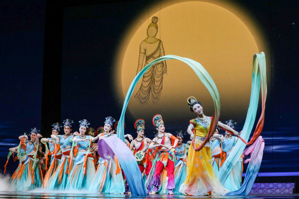 2025年9月22日,在敦煌舉辦的“相約敦煌”國(guó)際文化交流演出活動(dòng)上,甘肅省演藝集團(tuán)的演員展演《樂動(dòng)敦煌》選段?!稑穭?dòng)敦煌》借助對(duì)莫高窟壁畫、藏經(jīng)洞古籍的解讀梳理,活化敦煌古樂器、古樂譜研發(fā)成果,通過全息投影等手段,結(jié)合專業(yè)演員的表演,將莫高窟壁畫中的樂舞盛景生動(dòng)再現(xiàn),讓觀眾沉浸式感悟傳承千年的敦煌樂舞文化魅力。