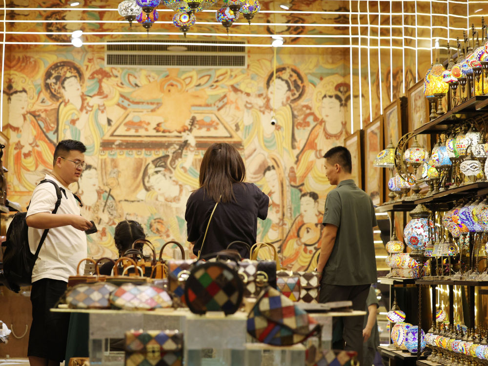 2025年6月26日,游客在敦煌夜市選購(gòu)文創(chuàng)產(chǎn)品。今年以來,敦煌市全面改造敦煌夜市等特色街區(qū),圍繞敦煌深厚的歷史文化底蘊(yùn),融入壁畫、絲路文化等元素,通過布設(shè)文化景觀小品、打造沉浸式餐飲體驗(yàn)空間、上線特色文創(chuàng)產(chǎn)品等方式,給游客帶來多元體驗(yàn),“夜經(jīng)濟(jì)”持續(xù)升溫,不斷釋放文旅消費(fèi)潛力。