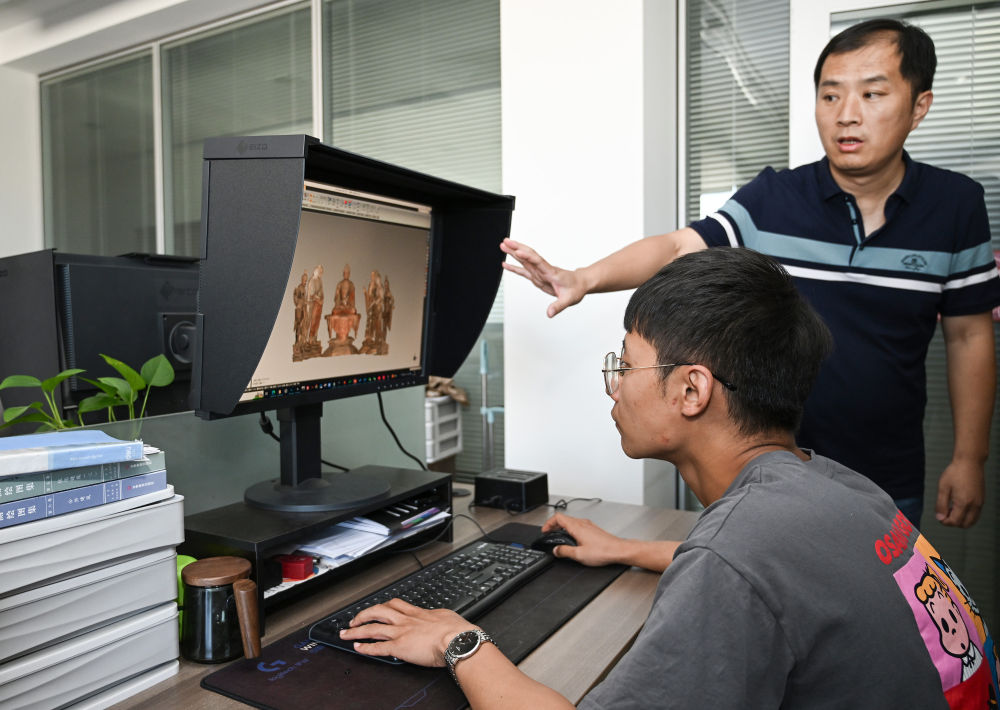 2023年8月3日,敦煌研究院文物數(shù)字化研究所的工作人員在展示莫高窟彩塑三維重建的成果。近年來,敦煌研究院持續(xù)加大文物保護(hù)基礎(chǔ)研究和應(yīng)用研究,不斷加強(qiáng)文物科技保護(hù)力度,提升科研平臺(tái)建設(shè),為文物保護(hù)和文化遺產(chǎn)事業(yè)發(fā)展奠定良好基礎(chǔ)。