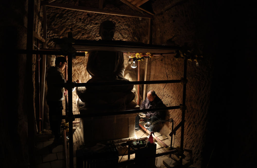 2024年11月2日,麥積山石窟藝術(shù)研究所保護(hù)研究室的文物修復(fù)師何舉在麥積山石窟133窟內(nèi)修復(fù)塑像。近年來,麥積山石窟藝術(shù)研究所等文物保護(hù)部門持續(xù)加大對(duì)麥積山石窟的搶救性保護(hù)和預(yù)防性保護(hù)工作力度,積極探索現(xiàn)代科學(xué)技術(shù)手段與傳統(tǒng)文物修復(fù)技藝相結(jié)合的保護(hù)修復(fù)新路徑。截至目前,麥積山石窟已有80個(gè)洞窟完成整體保護(hù)修復(fù)工作。