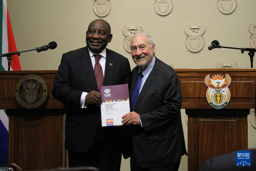 11月4日,在南非立法首都開普敦,二十國集團應對全球不平等問題特別獨立專家委員會主席、諾貝爾經(jīng)濟學獎得主約瑟夫·施蒂格利茨(右)向南非總統(tǒng)拉馬福薩提交關于全球不平等問題的報告。新華社發(fā)(沙姬拉·泰比攝)