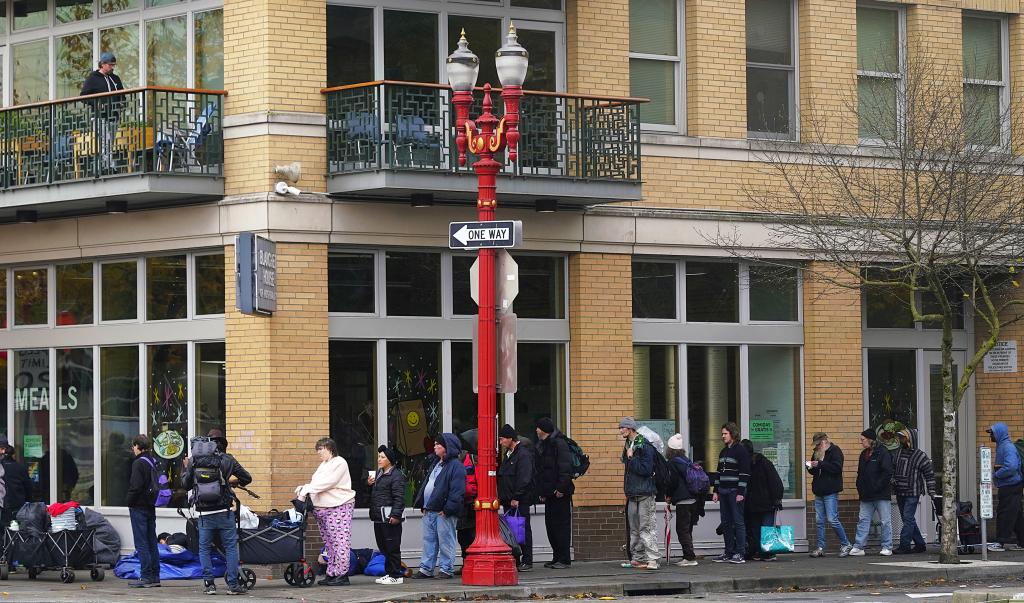 11月4日,在美國俄勒岡州波特蘭,等待領取免費食物的人們在街頭排起長隊。新華社記者吳曉凌攝
