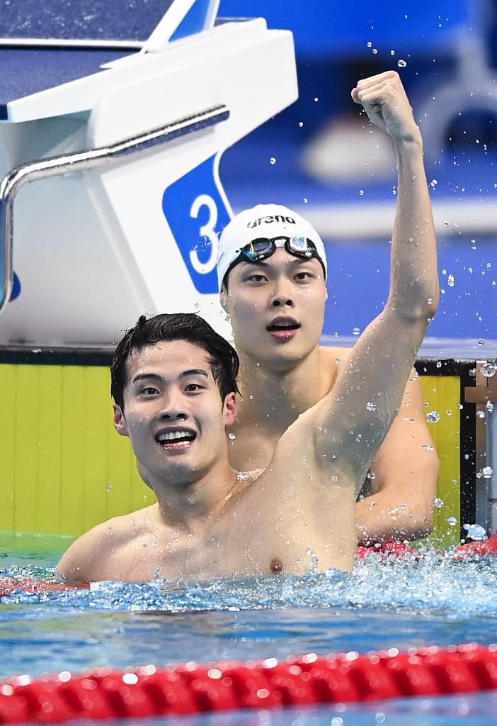 2023年9月27日,韓國選手黃宣優(yōu)(前)在杭州亞運會游泳項目男子200米自由泳決賽后慶祝奪冠。新華社記者 黃宗治 攝