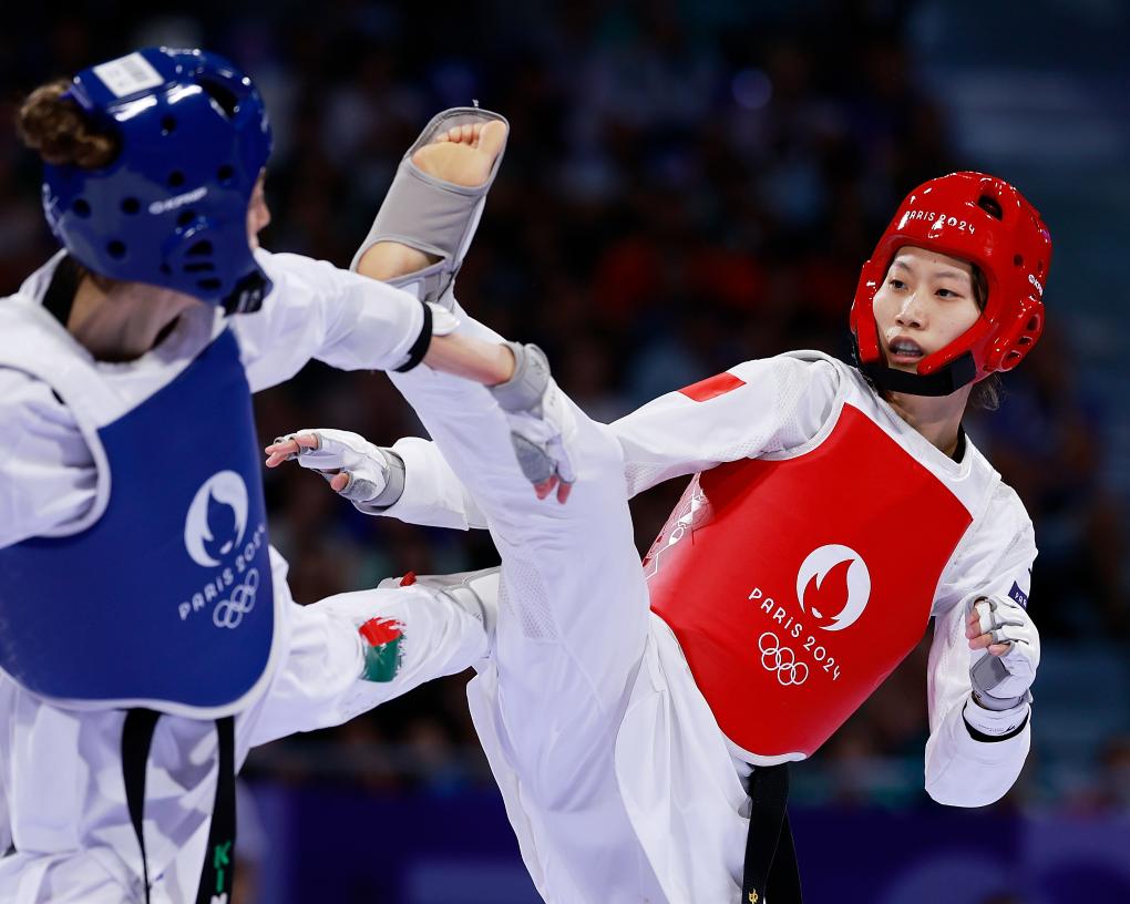 2024年8月8日,中國(guó)選手駱宗詩(shī)(右)在巴黎奧運(yùn)會(huì)跆拳道項(xiàng)目女子57公斤級(jí)銅牌賽上。新華社記者 費(fèi)茂華 攝