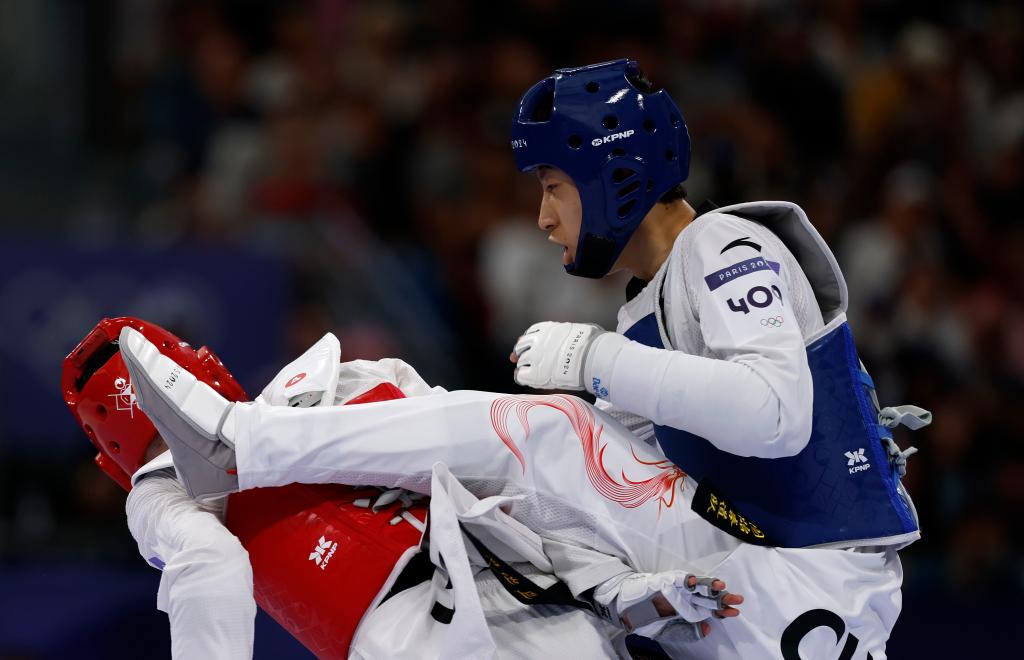 2024年8月8日,中國(guó)選手梁育帥(右)在巴黎奧運(yùn)會(huì)跆拳道男子68公斤級(jí)16強(qiáng)賽上。新華社記者 費(fèi)茂華 攝