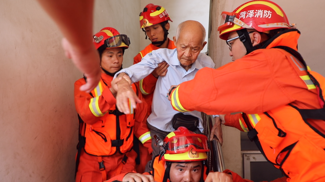 老人因?yàn)樾袆?dòng)不便,下樓過(guò)程中雖有消防員攙扶,走起路來(lái)還是很困難。走到最下面一層階梯時(shí),距離救生艇還有一大步的距離,此時(shí)增援隊(duì)的王振強(qiáng)一下?lián)涞乖谒C里“大爺,您從我背上踩著走過(guò)去,別怕,有我們呢!”