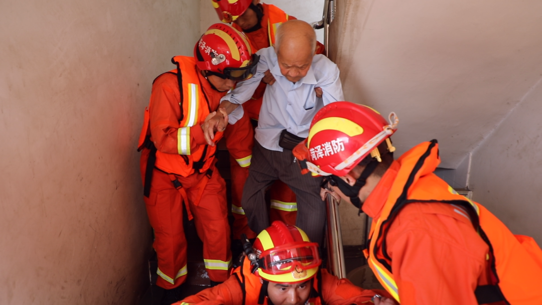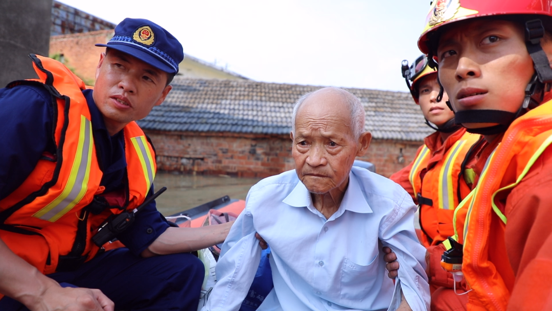 7月20日下午,在安徽全椒縣古河鎮(zhèn),一名90多歲的老人被困家中,從此處經(jīng)過(guò)的山東菏澤增援隊(duì)的消防員們聽到老人呼救聲后,立馬前往救援。